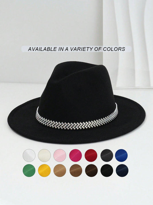 1pc Solid Felt Cowboy Hat With Rhinestone Strap, Luxury British Style Jazz Hat, Novelty Punk Rock Street Fashion, Suitable For Themed Parties