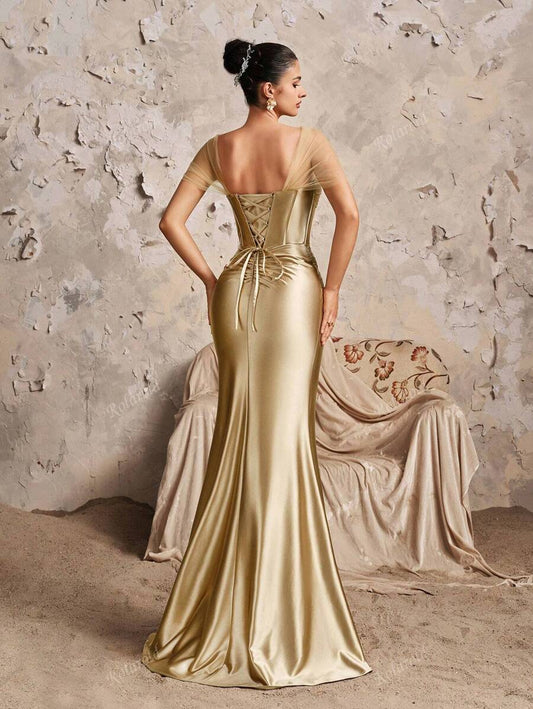 Vintage Muse Goddess Off-Shoulder Mesh Sleeve Patchwork Satin Mermaid Silhouette Luxury Sexy Dress, Bridesmaid Gown