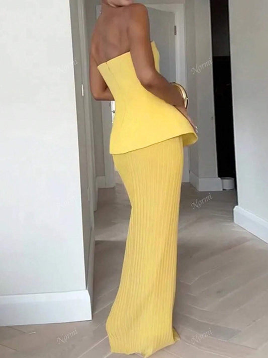 Women Waist Cinching Strapless Top And Matching Solid Color Skirt Set, Elegant Summer Outfit