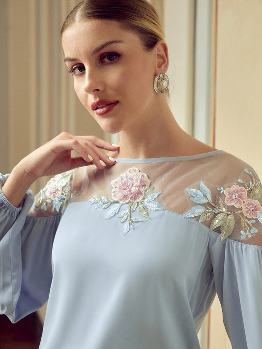 ZEYLAH Women's Floral Embroidery Mesh Lantern Sleeve Loose Elegant Blouse