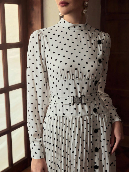 ZEYLAH Oblique Placket Waist Cinched Polka Dot Long Sleeve Elegant Dress