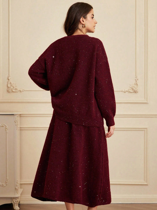 Aveloria Rosie Burgundy Wine Red Shiny Sequin Blended Casual Elegant Versatile Long Sweater & Midi Skirt 2 Pieces Set, Autumn/Winter