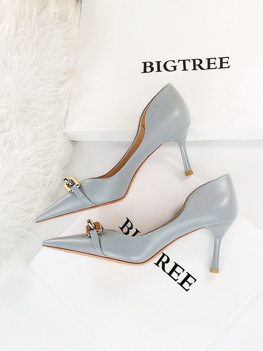 Vendor:SheinRegular price £25.50 GBPRegular priceUnit price / per£30.50 GBPSale price £25.50 GBPChain Decor Point Toe Stiletto Heeled Court Pumps, Fashionable Metal Chain In Smog Blue, Pure Metallic Monochrome High Heels For Women