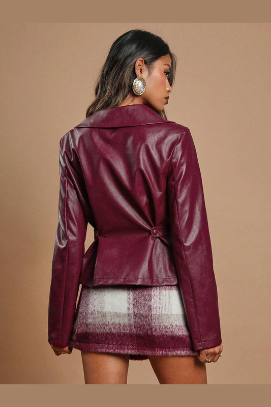 COSMINA Women's Burgundy Double-Breasted Formal Short PU Leather Blazer With Vintage Pleats