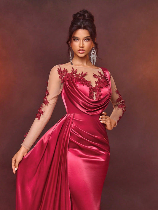 Glamrae Elegant Luxurious Embroidered Lace Applique Sheer Long Sleeve Stretch Satin Mermaid Maxi Dress, Wedding Guest Dress, Suitable For Weddings, Parties, Holidays, Galas, Evening Formal Wear, Party Dress,Gown