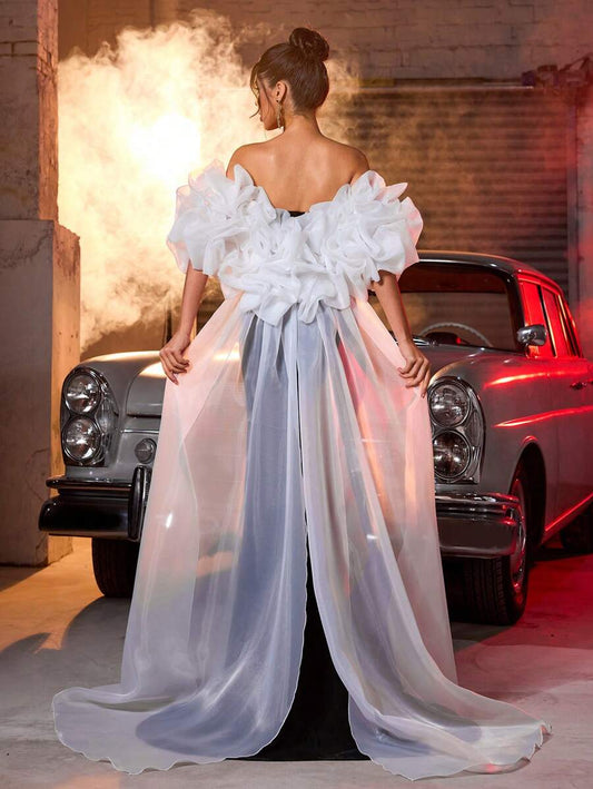 Regular price £64.19 GBPRegular priceUnit price / per£71.19 GBPSale price £64.19 GBPGlamrae Elegant Black Knit Novelty Asymmetric Neckline Fitted Fishtail (Detachable 2 Pieces Set) Contrast Exaggerated 3D Ruffle Trailing Evening Gown, Formal, Party Dress, For Wedding Guest