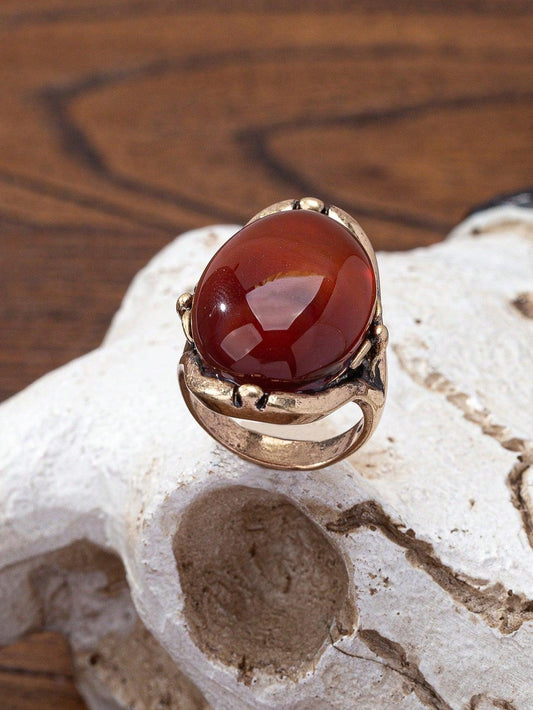 1pc Red Agate Stone Statement Ring, Antique Gold Color Retro Chunky Rings For Women, Burgundy Stone Rings, Women Jewelry Gift, Holiday Presents For Women, Vintage Rings (Natural Stone, Color Random)