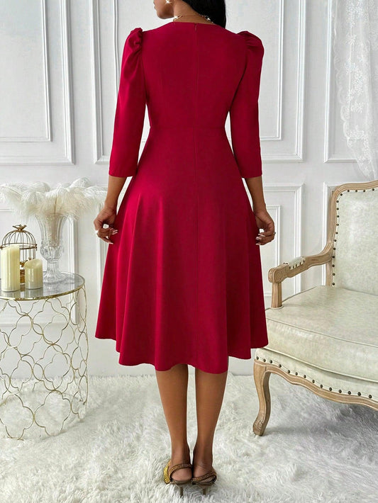 Lyxana Elegant Fashion Versatile Daily Date Round Neck 3/4 Sleeve Waist Flared Long Red Dress For Women For New Year Clothes Maxi Women Outfit