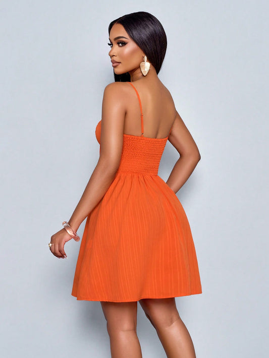 SOLERSUN Spring/Summer Women's Wear Everyday Leisure Spring Vacation Burnt Orange Textured Fabric Spaghetti Straps Twist At Bust Gathered Open Back Adjustable Tie Back Woven Mini A-Line Dress