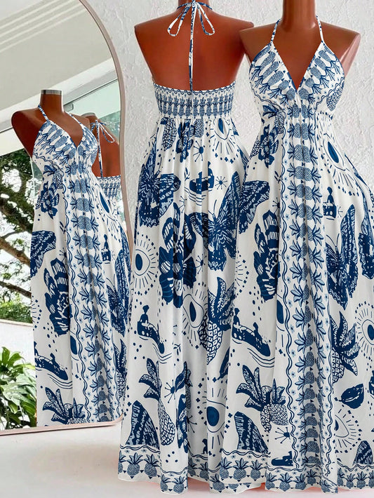 Ceyna Plus Size Women Bohemian Style Floral Print Beach Halter Dress
