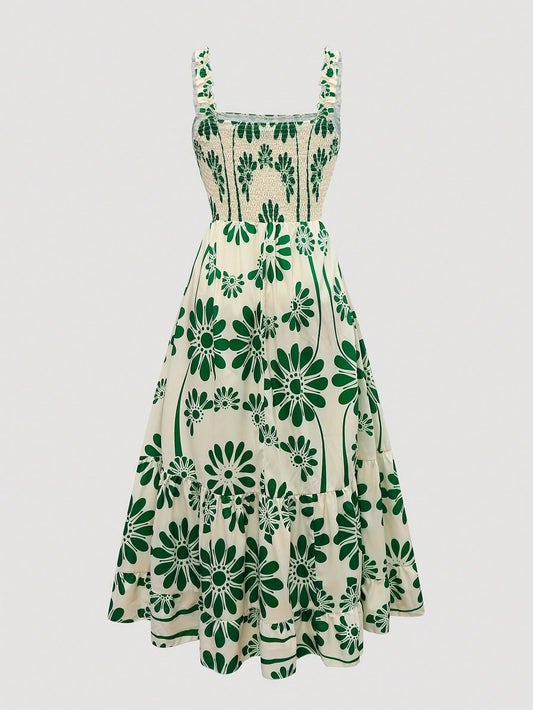 Plus Size Women Floral Print Ruffle Hem Spaghetti Strap Adjustable Bust A-Line Dress Maxi Women Outfit