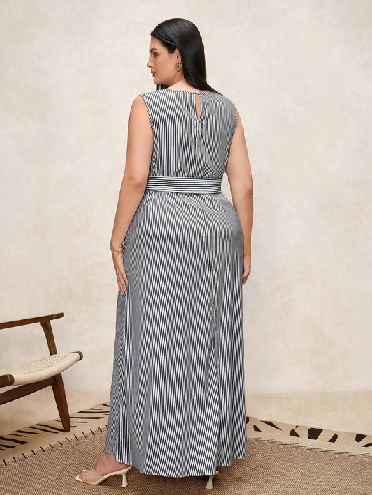 Regular price £19.97 GBPRegular priceUnit price / per£20.77 GBPSale price £19.97 GBPChikora Plus Size Women Linen Striped Round Neck Waist Bow Pocket Sleeveless Loose Casual Dress, Suitable For Various Occasions, Casual, Commute And Travel,Business Casual Woman,Summer Outfits For Women