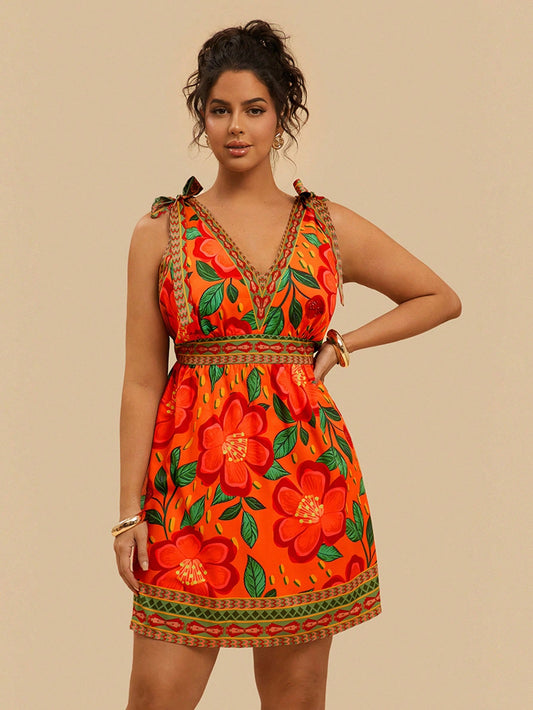 Travachic Plus Size Women's Casual Bohemian Summer Shoulder Tie Bow Floral Print Mini Dress Women Summer Clothing Women Short Dresses Summer