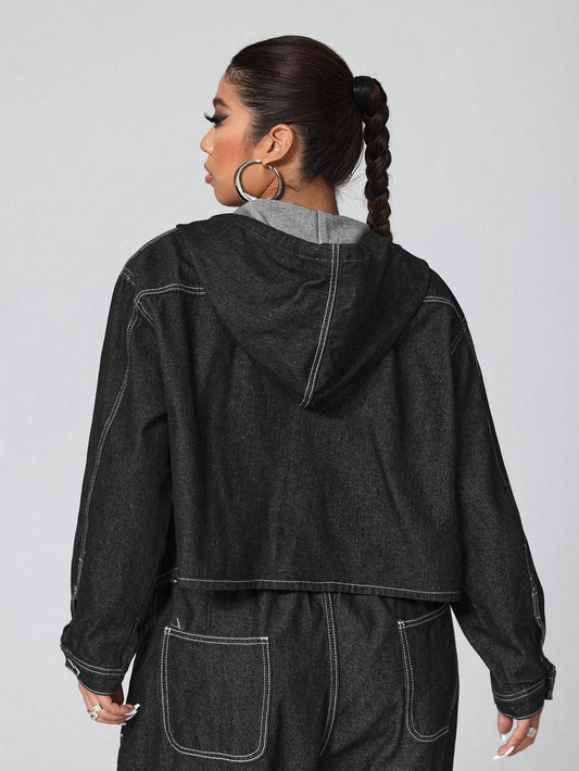 SHEIN ICON Plus Size Front Button Long Sleeve Casual Hooded Denim Christmas Clothes Women Thanksgiving Women Street Style Jacket