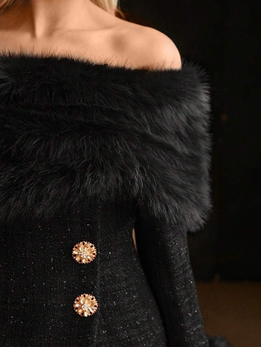 WOOL TWEED CONTRAST FUZZY TRIM OFF SHOULDER JACKET