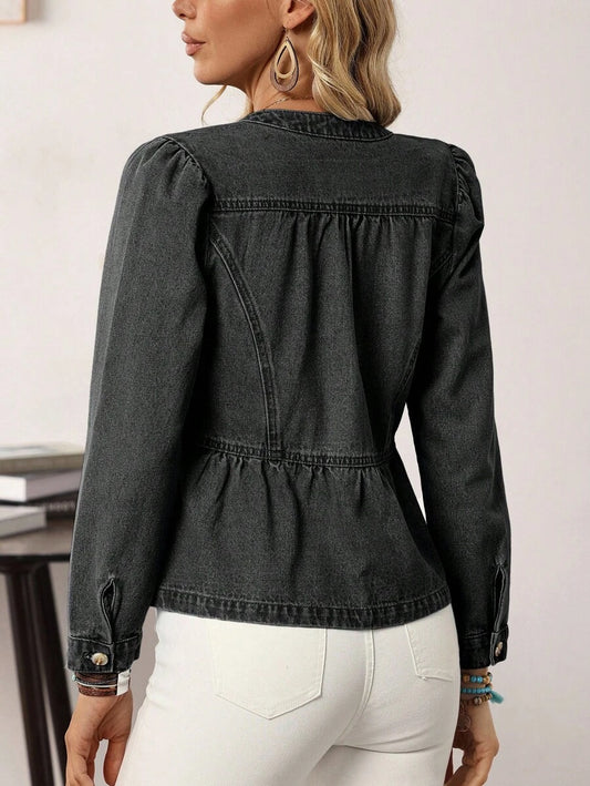 EMERY ROSE Plus Size Women Ruffle Hem Single-Breasted Denim Jacket,Fall Clothes For Women Denim Jackets For Women Blue Jean Jacket Women Cropped Denim Jacket Women Light Wash Denim Jacket Peplum Denim Jacket