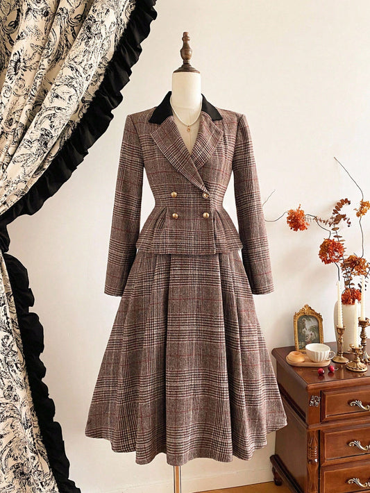 Vintamour Vintage Elegant Women's Suit Set, 2 Pieces With Pockets, Plaid Patchwork, Double-Breasted, A-Line Skirt, Casual/Work/Holiday In Fall/Winter