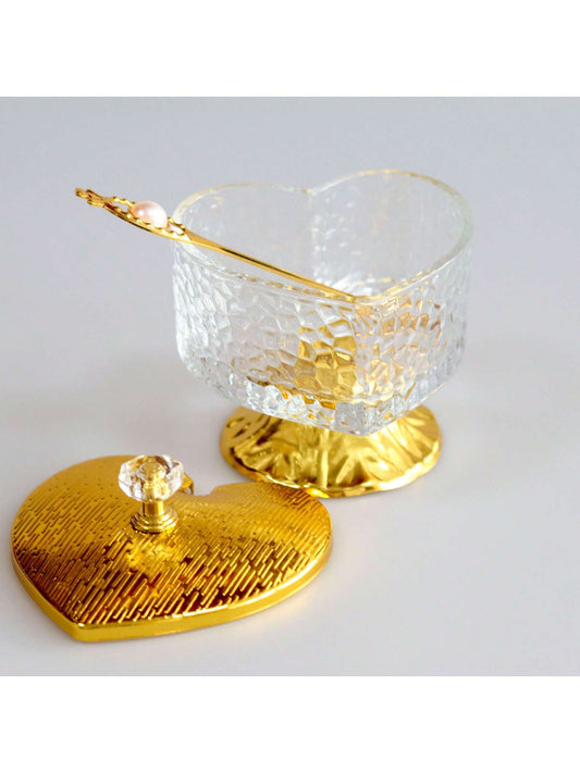 1set Heart Shaped Sugar Bowl, Patterned Glass Body Creamer Jar, Modern Style Seasoning Jar Christmas Gift