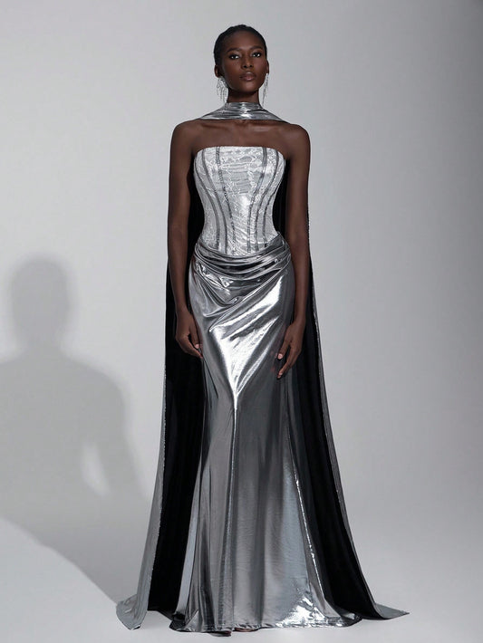 Elitara Elegant, Luxurious, Futuristic Knitted Coated Fabric With Stitching, French Embroidery, Herringbone Tummy Pleats, Hip-Hugging Dress With Flowing Collar, Women's Evening Dress, Mesh Dress, Dress