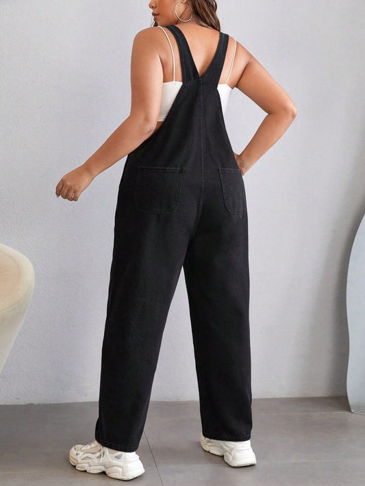 SHEIN EZwear Plus Letter Patched Detail Denim Overalls Without Tube Top