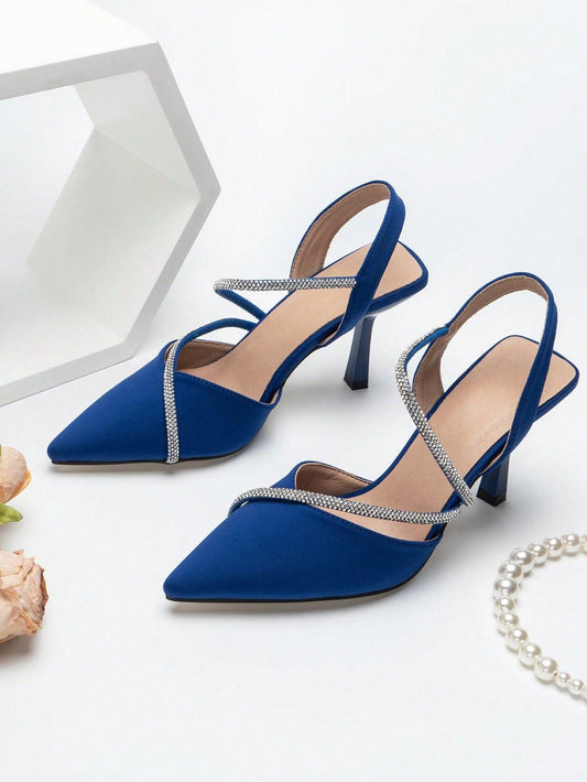 Regular price £21.50 GBPRegular priceUnit price / per£26.50 GBPSale price £21.50 GBPWomen Rhinestone Decor Point Toe Pyramid Heeled Pumps, Fashion Blue Elastane Slingback Pumps