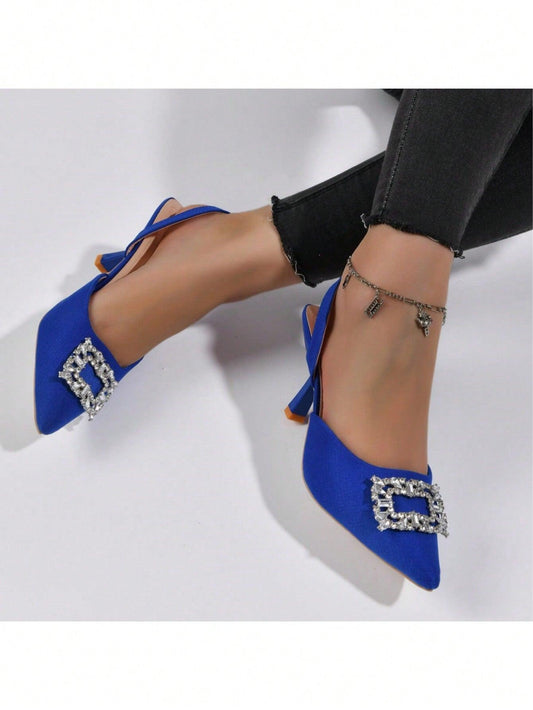 Women's Blue Pointed Toe High Heel Slip-On Sandals With Rhinestone Square Buckle, Elegant Shallow Heel Shoes For Office