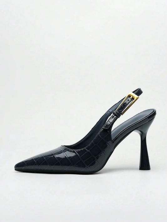 Women High Heels Pointed Toe Fashion Buckle Decor Patent Leather Slingback Pumps