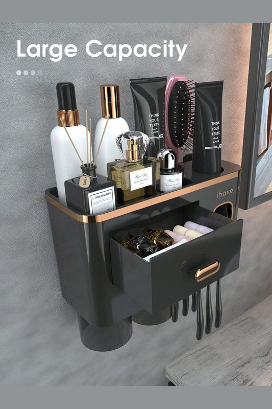 IHave Toothbrush Holders For Bathrooms - Upgrade Wall Mounted Toothbrush Holder With Toothpaste Dispenser - 2 Cups, Large Capacity Tray, Cosmetic Drawer - Bathroom Decor