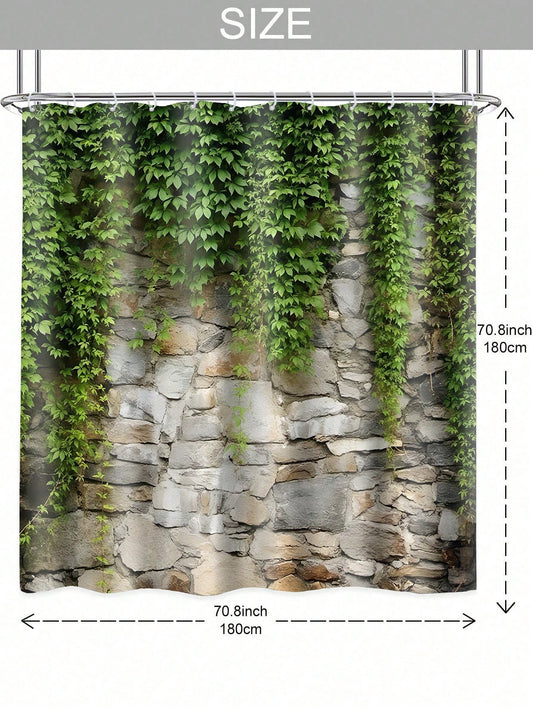 1pc Stone Wall Ivy Shower Curtain, Rustic Asymmetrical Gray/Beige Stone, Layered Green Ivy Texture, Natural Beauty Pattern, Waterproof Polyester Fabric Shower Curtain With 12 Hooks For Bathroom Decor Bathroom Accessories