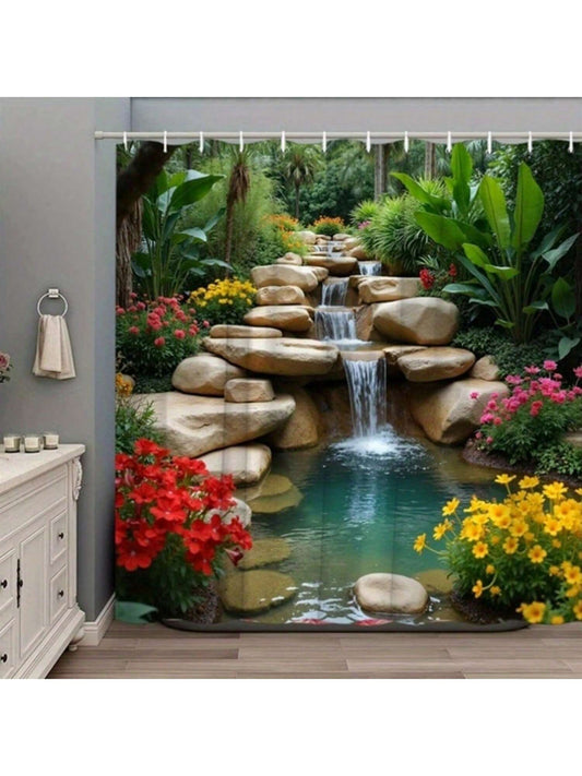 1pc Vibrant Garden Waterfall And Colorful Flowers Shower Curtain, Non-Light-Blocking Polyester Fabric With Hooks, Windows And Walls Bathtub Bathroom Home Decoration Shower Curtain, All Season Universal