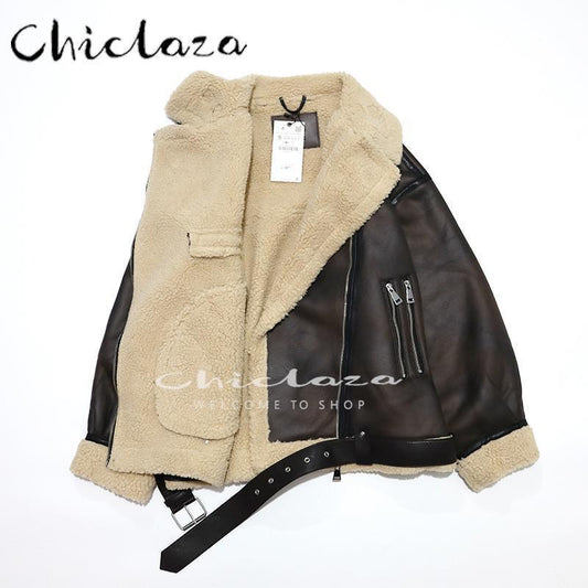 CHICLAZA Women's Winter Thick Warm Lambswool Faux Leather Jacket