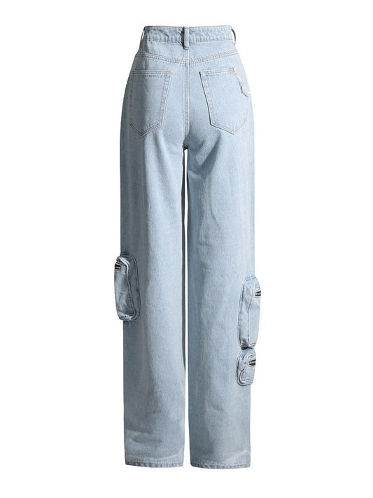 Washed Blue Pocket Decorated High Waist Wide-leg Jeans Women Casual Jeans