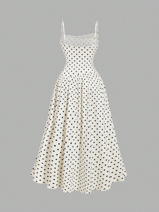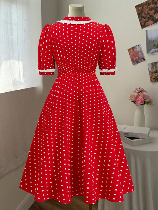 Sweetra Plus Size Romantic Polka Dot Color Blocking Ruffle Trim Princess Style Dress