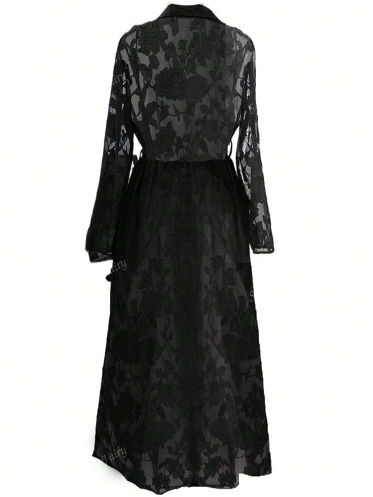 Elegant Three-Quarter Sleeve Knotted Waist Jacquard Mesh Maxi Dress