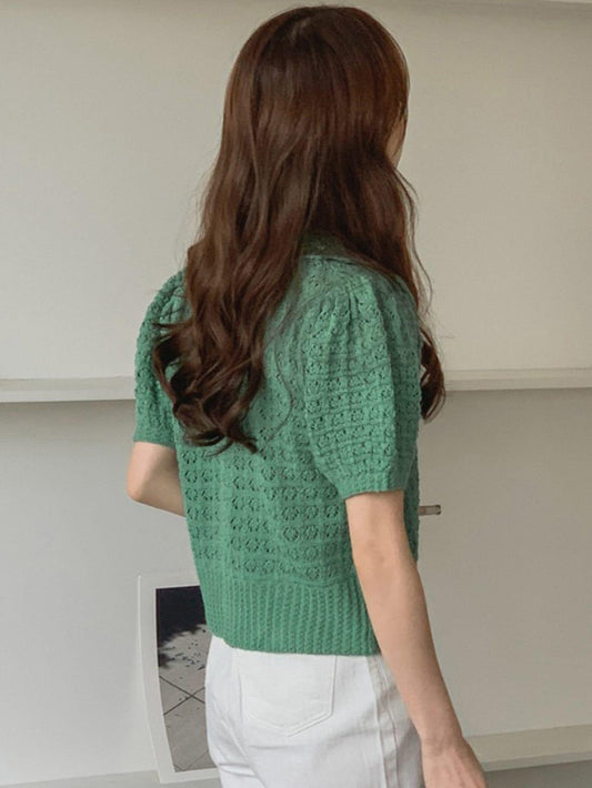 DAZY Puff Sleeve Button Half Placket Textured Knit Top
