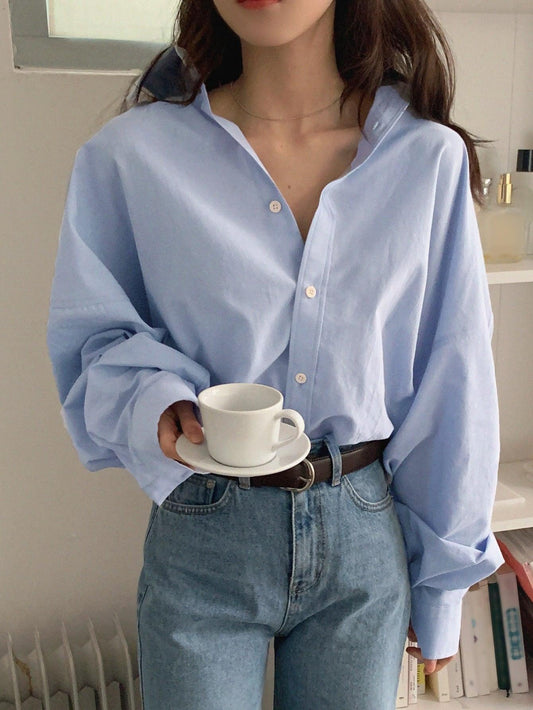 DAZY Solid Button Up Drop Shoulder Oversized Shirt,Long Sleeve Tops
