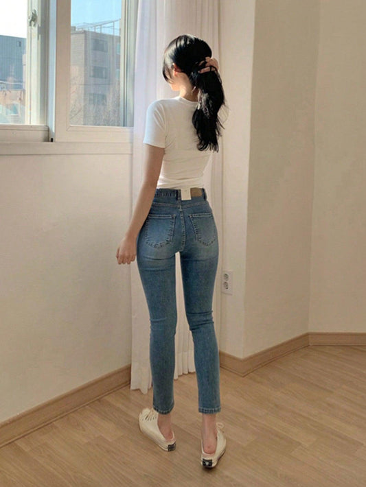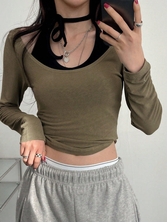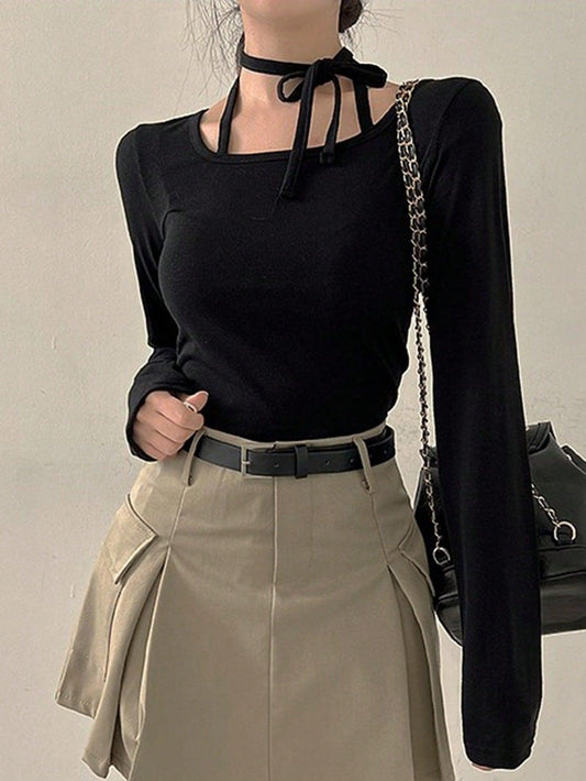 DAZY Women Casual Solid Color Bow Tie Tight T-Shirt, Spring And Autumn