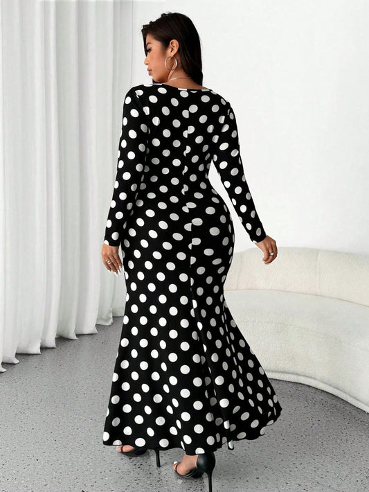 Plus Size Elegant Polka Dot Print Knot Detail Splicing Dress, Autumn Maxi Women Outfit