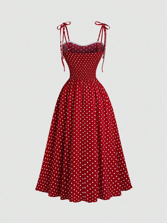 Sweetra French Retro Dot Print Spaghetti Strap Back Tied Waist Long Dress, Vintage Style, Red Polka Dot For Vacation