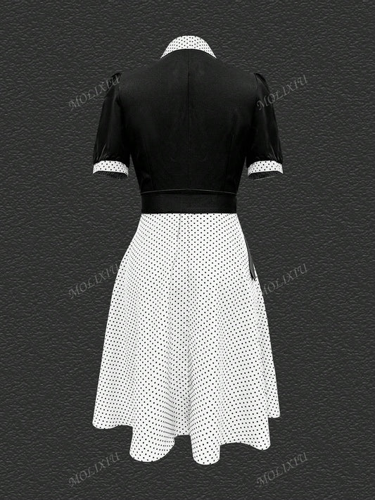 Regular price £20.64 GBPRegular priceUnit price / per£27.64 GBPSale price £20.64 GBPWomen Elegant Color Block Collared Short Sleeve Tie-Waist Polka Dot Dress, Summer