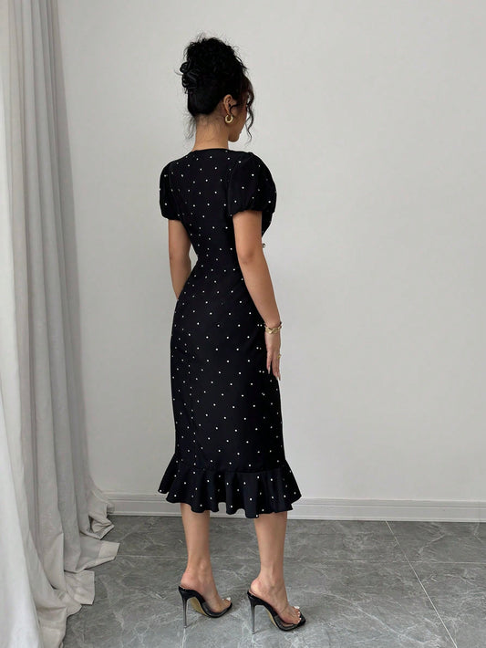 Rafferiza Elegant Lantern Sleeve Bowknot Ruffle Polka Dot Print Dress, Stylish Dress For Women, Black