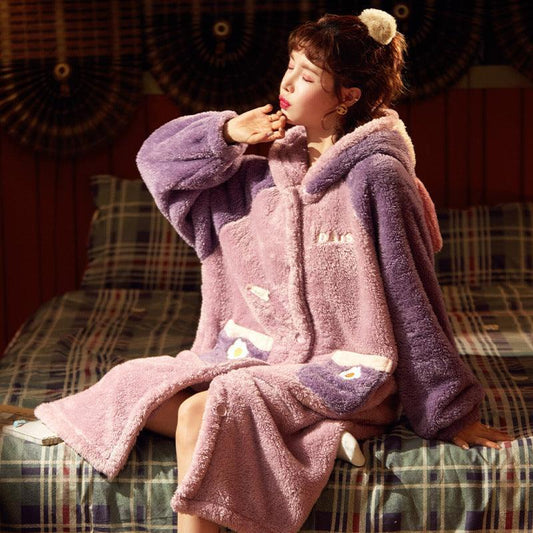 Women's Autumn And Winter Long Thick Hooded Coral Velvet Nightgown