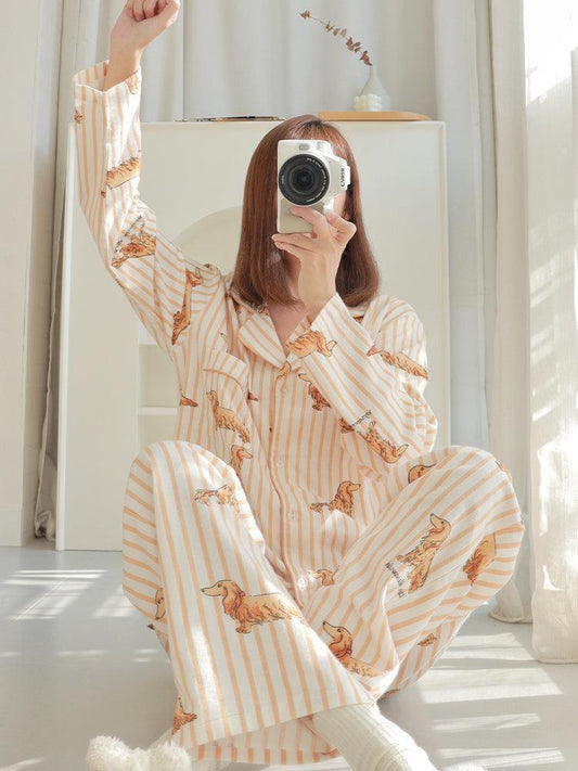 Dog Striped Long-sleeved Brushed Cotton Pajamas