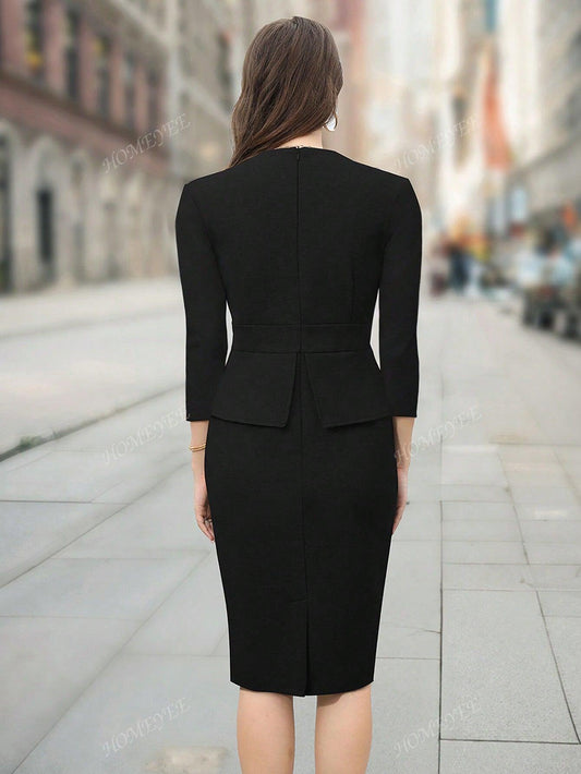 HOMEYEE Square Collar 3/4 Sleeve Vintage Casual Business Workwear Bodycon Dress