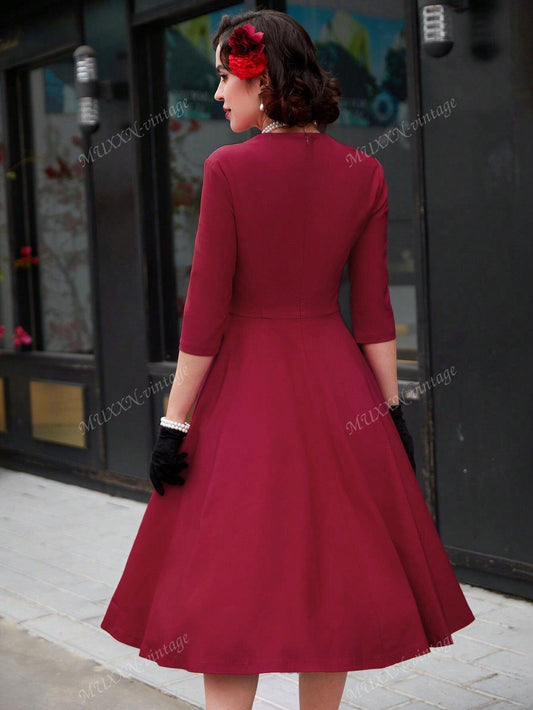 Simplee Women Vintage Style Solid Color Lace Patchwork Long Sleeve Waist Fit Dress, Suitable For Valentine's Day