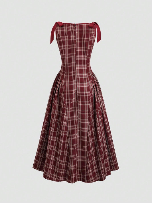 Sweetra Vintage Houndstooth Color Blocking Bow Tie Waist Slim Fit Strappy Women's A-Line Midi Dress With Extra-Large Skirt, Autumn/Winter Maxi Women Outfit