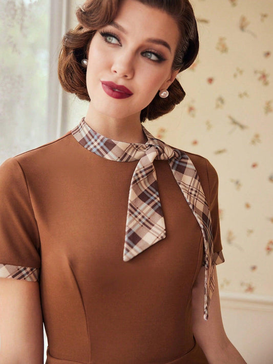 Vintamour Tartan Tie Detail Dress Concert Summer Women Long Dress Summer Dress Dress With Sleeves Vintage Clothes Khaki Vintage Dress Old Money Aesthetic Maroon Brown