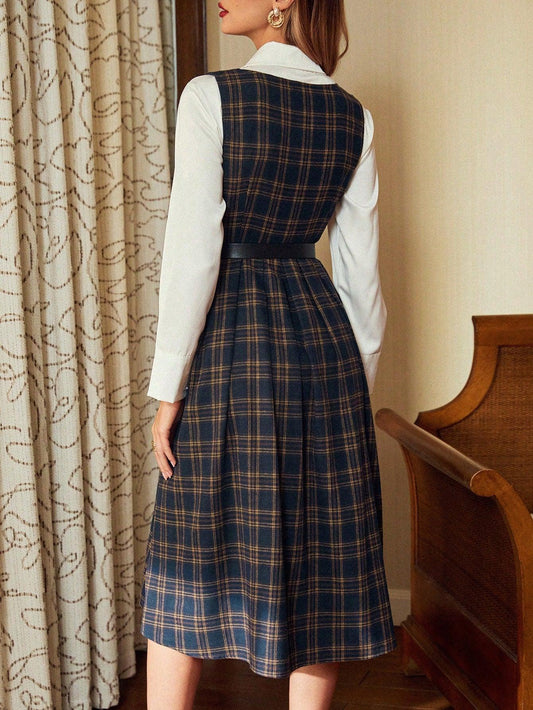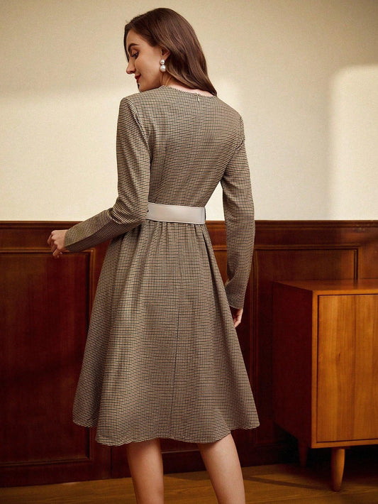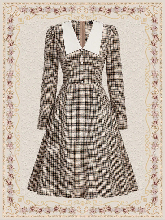 Vintamour Retro Classic Elegant Women Dress, Fitted Plaid Contrast Collar Long Sleeve Dress, Autumn/Winter Valentine Day Dresses For Women Elegant Business Casual Woman Church Clothes Women