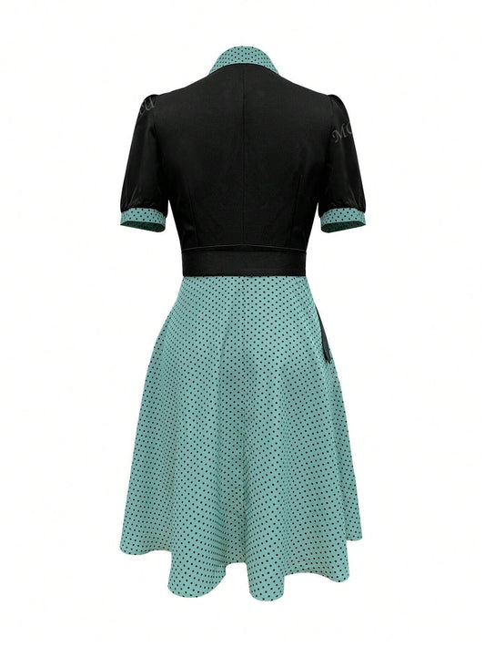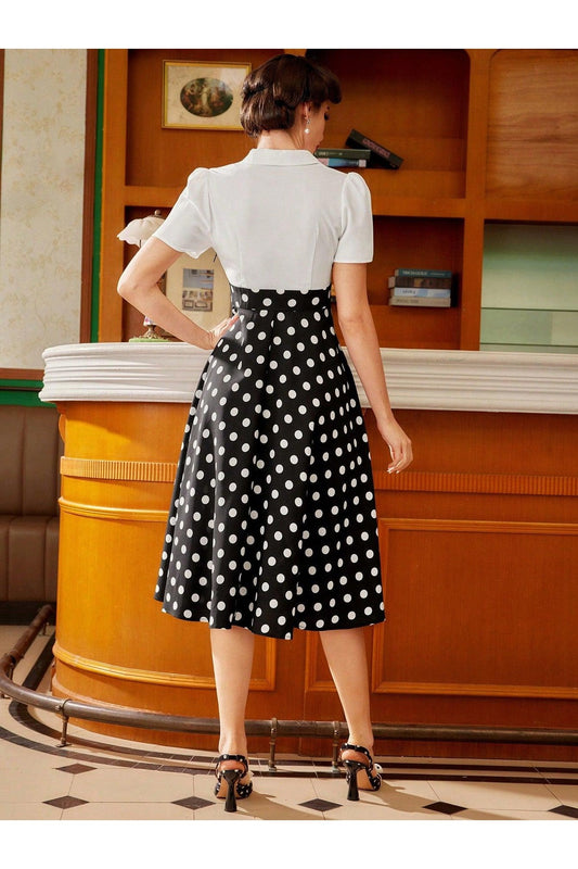 Vintamour Vintage Elegant Women Dress, Black And White Polka Dot Print, V-Neck Collared Shirt, Short Sleeve Patchwork Holiday Umbrella Swing Dress, Spring