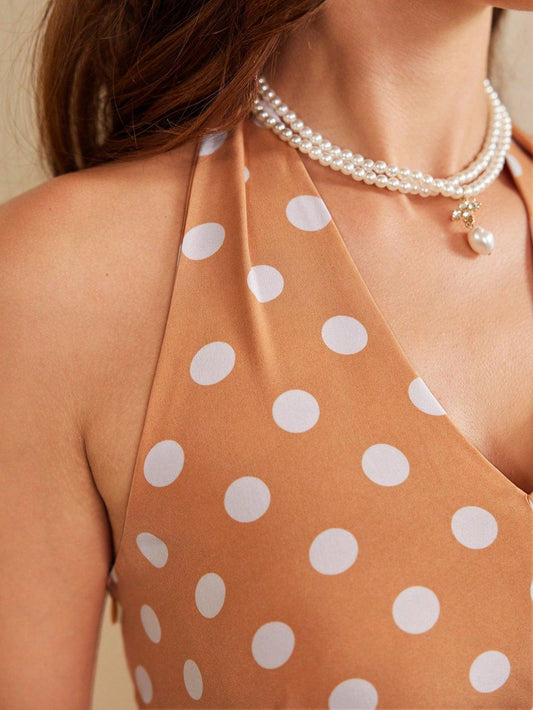 Vintamour Polka Dot Print Ruched Front Halter Neck Backless Dress Vintage Elegant Festival Outfits Casual Dress Sundress Bow Flowy Dress Halter Dress Festival Clothes One Piece Outfit Summer Dress Midi